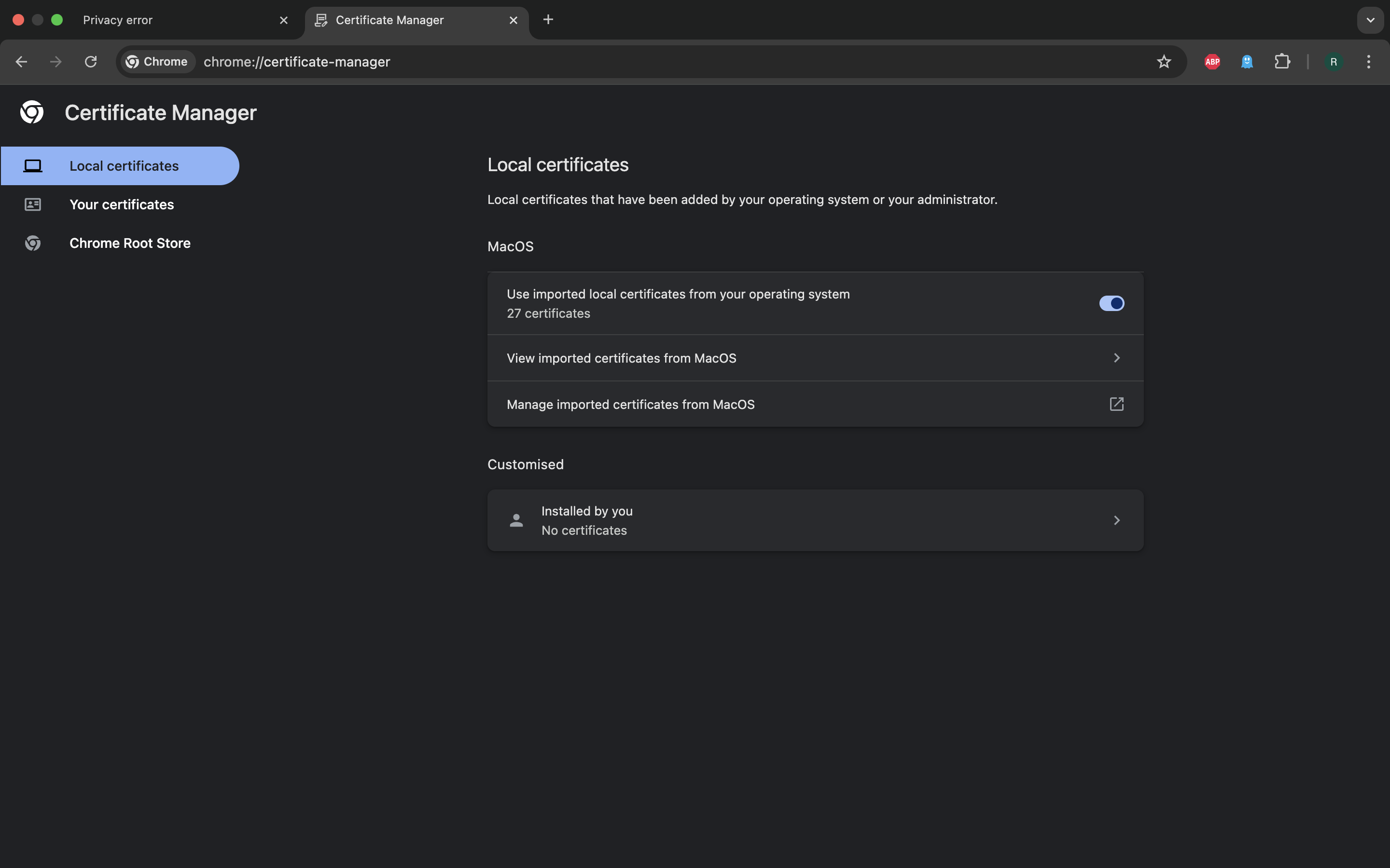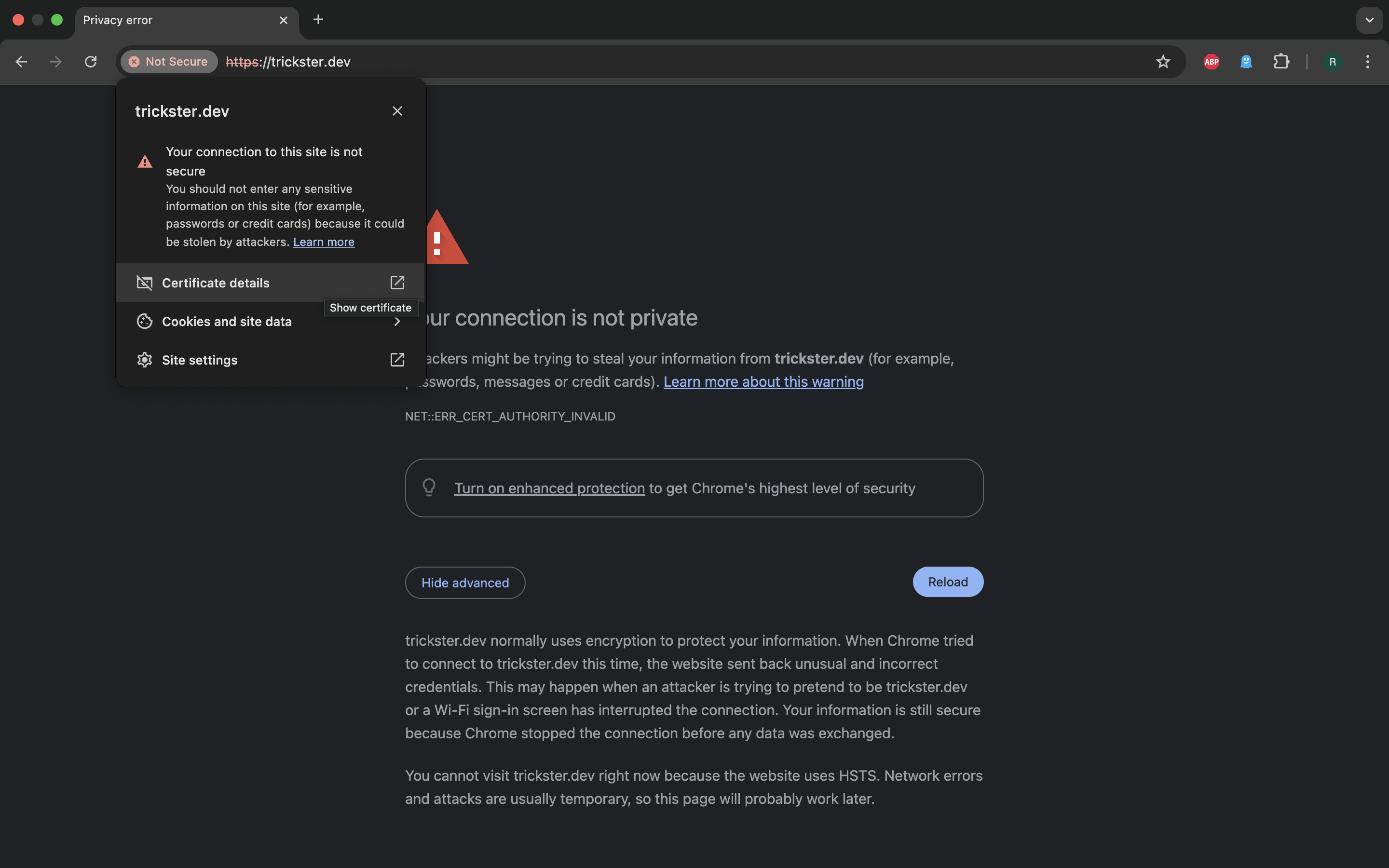 But now there’s a matter of setting up X.509 certificate generated by mitmproxy so that it is trusted by client application(s). For example, Chrome won’t let us access the proxied site if we don’t address this matter.