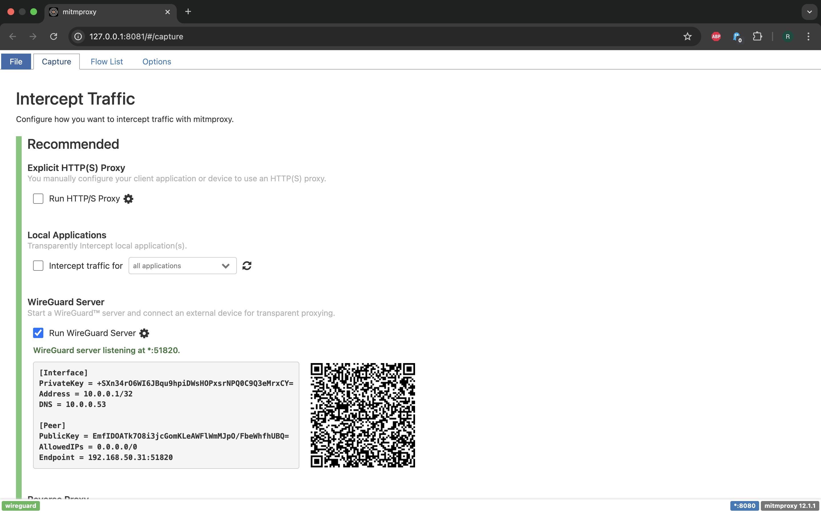 In Capture tab we will have QR code we can scan with the official WireGuard app, which will guide us through a flow of setting it up on a mobile device. However, before you do that it is best to have X.509 certificate installed by going through the default mode setup procedure or some other way, so that TLS flows can be properly intercepted.
