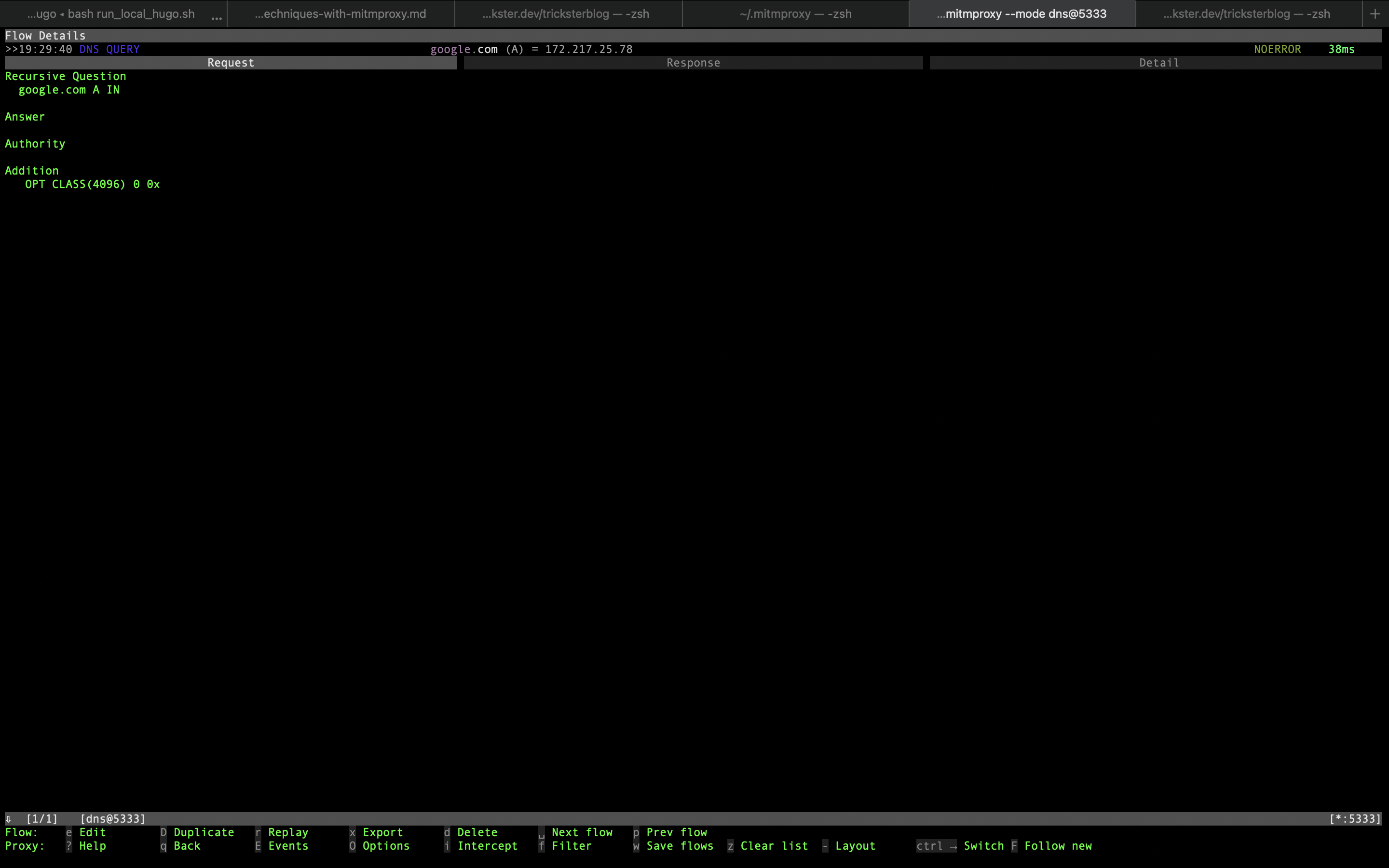 We can also use mitmproxy as a simple DNS server that implements a subset of the protocol (only A and AAAA queries) by running it in DNS mode: