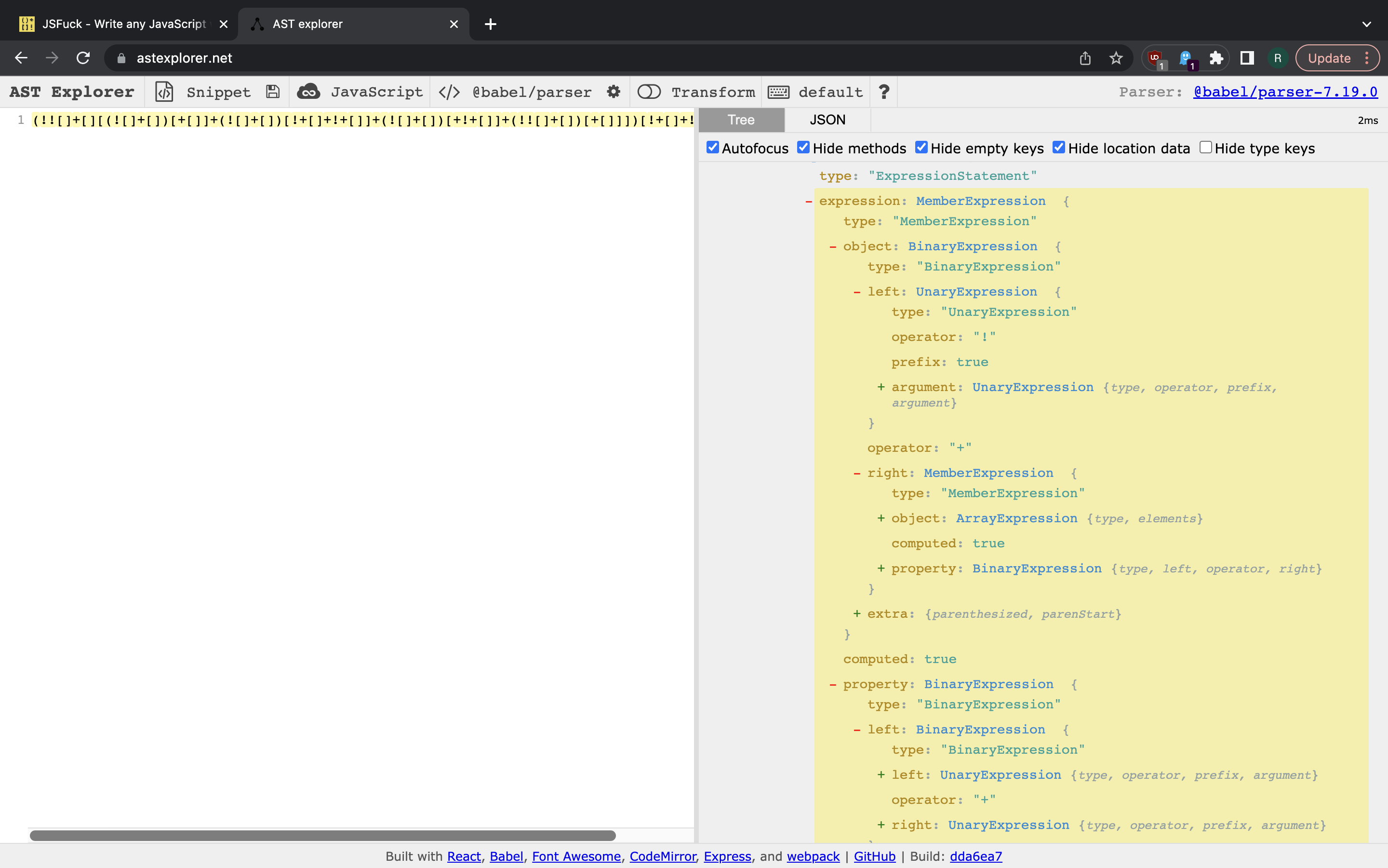 In the previous post we went through using Babel AST transforms to simplify JSFuck-generated unary and binary expressions. This was shown to undo a lot, but not all of the obfuscation. What we still have to do is to deal with certain API and runtime hacks that JSFuck leverages to obfuscate some of the characters that are not covered just by abusing type coercion and atomic components of JS (string and array indexing, logical/arithmetic operations).