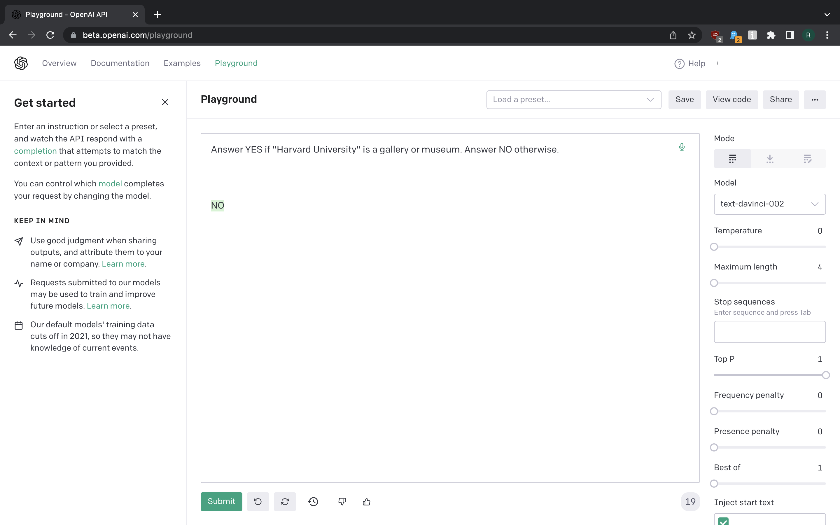 So what do we do? Well, given that GPT-3 was trained on massive amounts of text, it should be able to tell based on institution name if it is of interest for scraping. We just need to ask it properly. For example, we could give it a prompt: